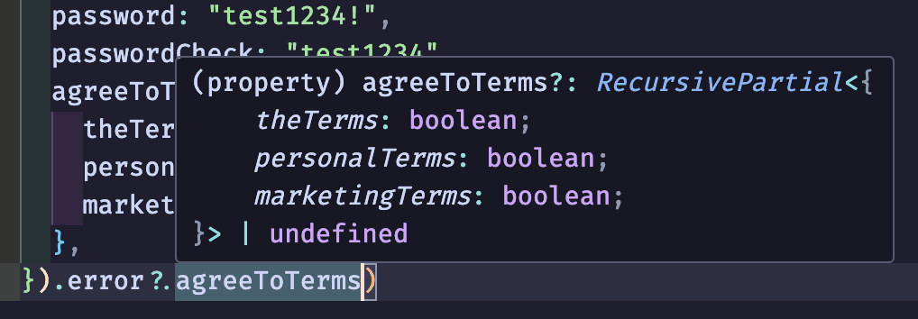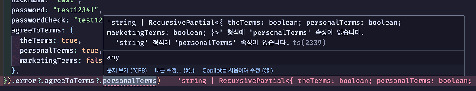RecursivePartial 타입을 아래와 같이 수정한다고 가정해보겠습니다. 이 경우 점 표기법 등으로 깊숙한 위치의 프로퍼티에 접근할 때, 각 단계에서 해당 값이 string이 아닌 object인지 매번 확인해야 합니다. 그렇지 않으면 모든 프로퍼티 접근 시 타입 에러가 발생하게 됩니다. 따라서 root 값에 접근하는 경우에 대해 실제 타입을 그대로 반영하기보다는 그때그때 as string으로 단언해버리는 편이 훨씬 덜 번거롭다고 판단했습니다.